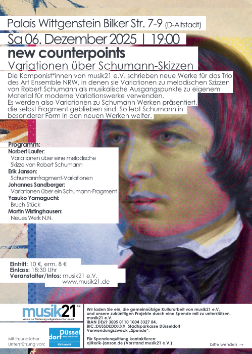 Das Kammerorchester des Art Ensemble NRW unter der Leitung von Miro Dobrowolny spielt Werke von Komponist*innen aus Brandenburg/Berlin und Düsseldorf. Das Konzertprogramm ist einAustauschkonzert mit dem Festival Intersonanzen Potsdam