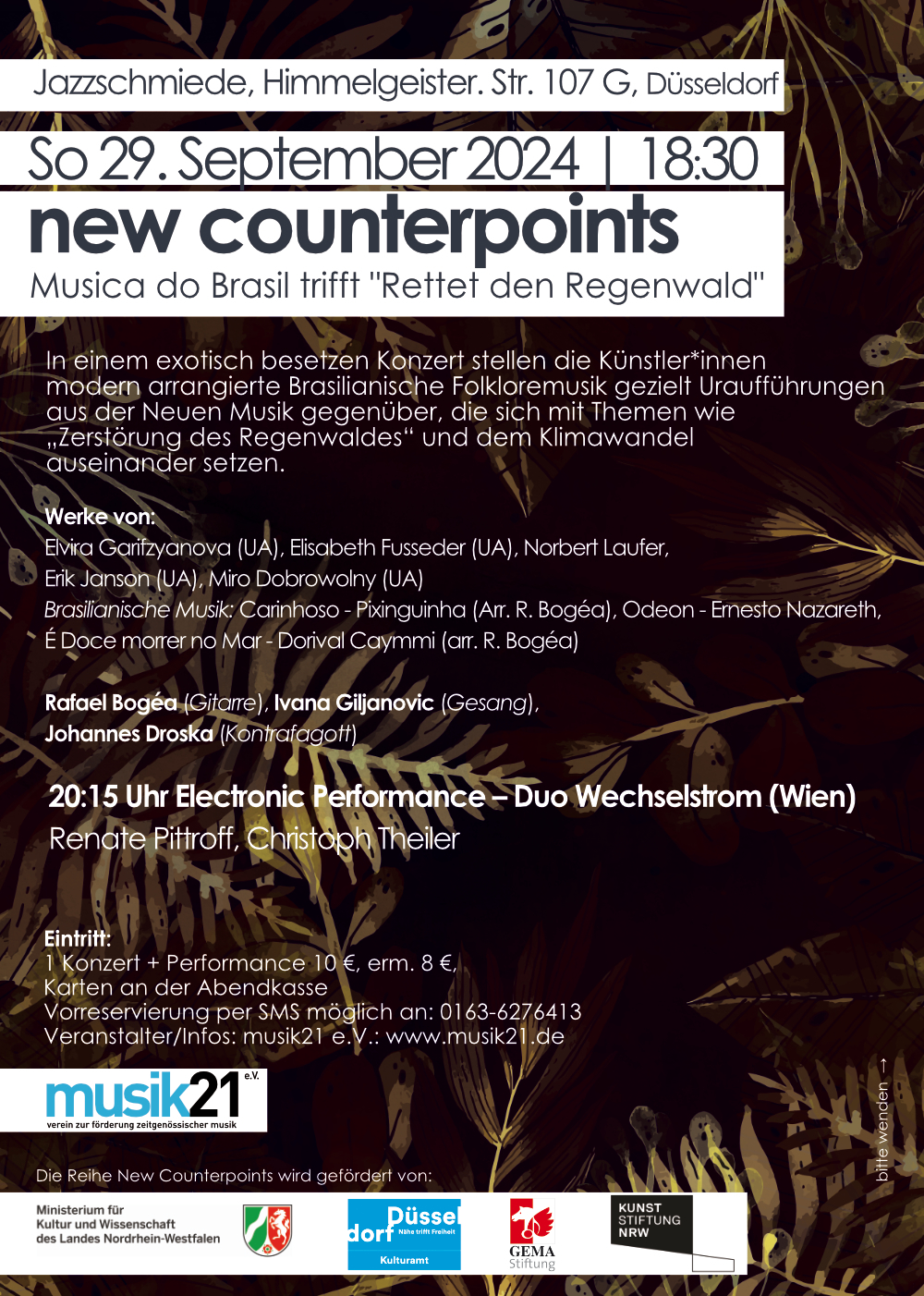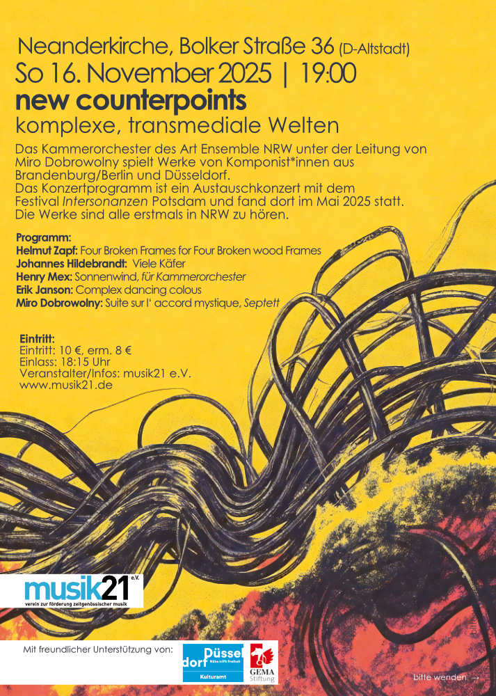 Das Kammerorchester des Art Ensemble NRW unter der Leitung von Miro Dobrowolny spielt Werke von Komponist*innen aus Brandenburg/Berlin und Düsseldorf. Das Konzertprogramm ist einAustauschkonzert mit dem Festival Intersonanzen Potsdam