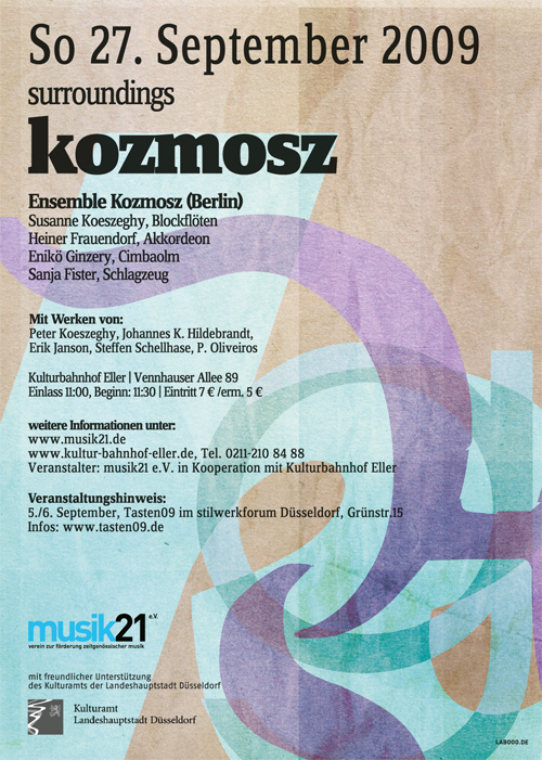 Das Konzert entführt in neue, fein gewobene, teils skurrile Klangwelten mit der bisher in zeitgenössischer Musik wohl weltweit einzigartigen Besetzung: Cimbalom, Akkordeon, Blockflöten und Schlagzeug des 2007 neu gegründeten Berliner Ensemble Kozmosz.  Die Komponisten und Inspirationsquellen für die Werke sind so vielfältig und farbig wie der Klangkörper selbst. Pèter Köszeghy ließ sich, inspiriert durch das Wort/Phänomen der Schizophrenie zu Abspaltungen von Tönen und Motiven von einem gemeinsamen Ursprung anregen. Janson thematisiert in „Tanz der Rhizome II“ das auf Deleuze/Guattari zurück gehende philosophisch-politische Prinzip des „Rhizoms“: Wucherungen, Verflechtungen, Vernetzungen, oder auch Kommunikationsformen, die teils sehr komplex, nicht-hierarchisch sind und jederzeit beginnen, abbrechen oder latent unter der Oberfläche weiter laufen und wieder aufgegriffen werden können. Ähnlich verläuft die Musik in schillernden, wechselnden Motiven, Rhythmen und Klangkombinationen, die nicht auf einem gemeinsamen Keim oder einer hierarchischen/dominierenden Ursprungs-Idee beruhen. In Oliveiras „Prisma“ geht es um die unterschiedliche Zerlegung, Kombination und Hervorhebung von Klangspektren und Farben, inspiriert durch das Objekt des Prisma, das weißes Licht in verschiedene Bestandteile zerlegt und – je nach Bewegung des Prismas – unterschiedliche Spektralfarben hervorhebt.